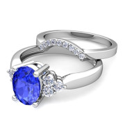 Three Stone Diamond and Ceylon Sapphire Engagement Ring Bridal Set in Platinum, 8x6mm