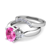 Three Stone Diamond and Pink Sapphire Engagement Ring Bridal Set in 14k Gold, 9x7mm