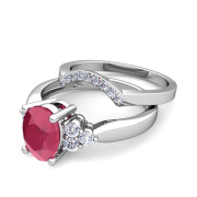 Three Stone Diamond and Ruby Engagement Ring Bridal Set in Platinum, 8x6mm