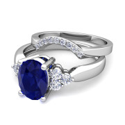 Three Stone Diamond and Sapphire Engagement Ring Bridal Set in 14k Gold, 7x5mm