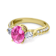 Vintage Inspired Diamond and Pink Sapphire Three Stone Ring in 18k Gold, 8x6mm