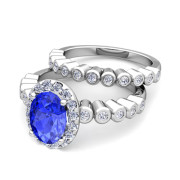 Halo Bridal Set: Bezel Diamond and Ceylon Sapphire Wedding Ring Set in Platinum, 7x5mm