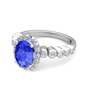Bezel Set Diamond and Ceylon Sapphire Halo Engagement Ring in 14k Gold, 7x5mm