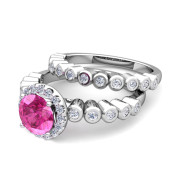 Halo Bridal Set: Bezel Diamond and Pink Sapphire Wedding Ring Set in Platinum, 7mm