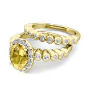 Halo Bridal Set: Bezel Diamond and Yellow Sapphire Wedding Ring Set in 18k Gold, 9x7mm