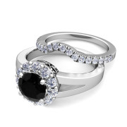 Black and White Diamond Halo Engagement Ring Bridal Set in 14k Gold, 6mm