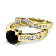 Pave Diamond and Solitaire Black Diamond Engagement Ring Bridal Set in 18k Gold, 7mm