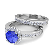 Halo Bridal Set: Diamond and Ceylon Sapphire Engagement Wedding Ring in 14k Gold, 7mm