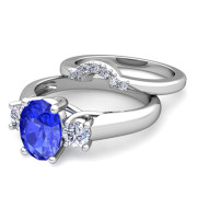 Classic Diamond and Ceylon Sapphire Three Stone Ring Bridal Set in 14k Gold, 9x7mm