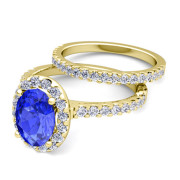Bridal Set: Pave Diamond and Ceylon Sapphire Engagement Wedding Ring in 18k Gold, 8x6mm