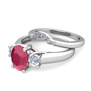 Classic Diamond and Ruby Three Stone Ring Bridal Set in Platinum, 8x6mm