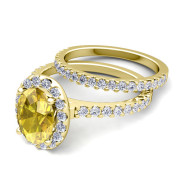 Bridal Set: Pave Diamond and Yellow Sapphire Engagement Wedding Ring in 18k Gold, 7x5mm