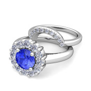 Ceylon Sapphire and Halo Diamond Engagement Ring Bridal Set in Platinum, 7mm