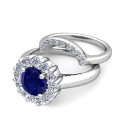 Blue Sapphire and Halo Diamond Engagement Ring Bridal Set in 14k Gold, 7mm