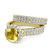 Two Row Diamond and Yellow Sapphire Engagement Ring Bridal Set in 18k Gold, 5mm