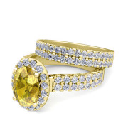 Two Row Diamond and Yellow Sapphire Engagement Ring Bridal Set in 18k Gold, 8x6mm