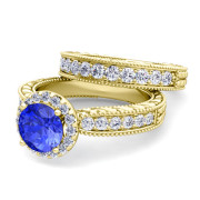 Vintage Inspired Diamond and Ceylon Sapphire Engagement Ring Bridal Set in 18k Gold, 7mm