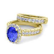 Vintage Inspired Diamond and Ceylon Sapphire Engagement Ring Bridal Set in 18k Gold, 8x6mm