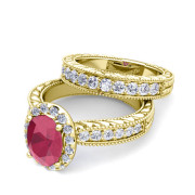 Vintage Inspired Diamond and Ruby Engagement Ring Bridal Set in 18k Gold, 9x7mm