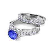 Bridal Set of Heirloom Diamond and Ceylon Sapphire Engagement Wedding Ring in Platinum, 7mm