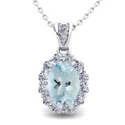 Halo Diamond and Aquamarine Necklace in 14k Gold Pendant 8x6mm