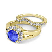 Radiant Diamond and Ceylon Sapphire Halo Engagement Ring Bridal Set in 18k Gold, 6mm
