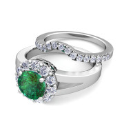 Radiant Diamond and Emerald Halo Engagement Ring Bridal Set in Platinum, 7mm