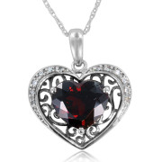Filigree Diamond and Garnet Heart Necklace in 10k White Gold