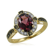 Art Deco Inspired Diamond, Smoky Quartz, Rhodolite Garnet Ring in 14k Yellow Gold, 9x7mm
