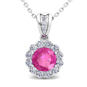 Diamond and Pink Sapphire Pendant in 14k Gold Halo Necklace 6mm