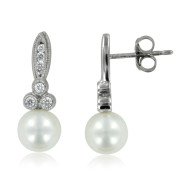 Milgrain Diamond and Pearl Drop Earrings in 10k White Gold