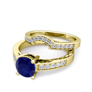 Pave Diamond and Solitaire Sapphire Engagement Ring Bridal Set in 18k Gold, 7mm