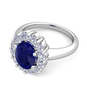 Halo Diamond and Blue Sapphire Diana Ring in Platinum, 9x7mm
