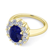 Halo Diamond and Blue Sapphire Diana Ring in 18k Gold, 8x6mm