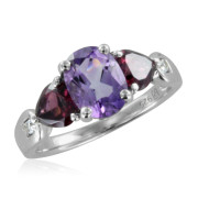 Heart Natural Garnet and Amethyst Three Stone Ring in Sterling Silver, 2.24 cttw