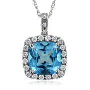 White Sapphire and Cushion Cut Blue Topaz Necklace in 10K White Gold, Diamond Accent