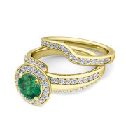 Wave Diamond and Emerald Engagement Ring Bridal Set in 18k Gold, 6mm