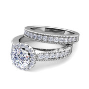 Halo Bridal Set: Milgrain Diamond Engagement Wedding Ring Set in 14k Gold