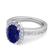 Diamond and Sapphire Halo Engagement Ring in Platinum Channel Set Ring, 8x6mm