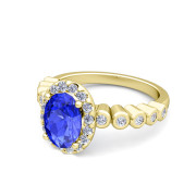 Bezel Set Diamond and Ceylon Sapphire Halo Engagement Ring in 18k Gold, 8x6mm