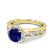 Milgrain Diamond and Sapphire Halo Engagement Ring in 18k Gold, 5mm
