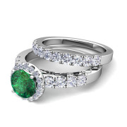 Halo Bridal Set: Pave Diamond and Emerald Wedding Ring Set in 14k Gold, 7mm