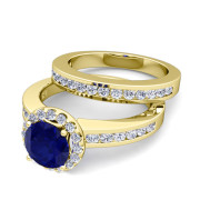 Halo Bridal Set: Diamond and Sapphire Engagement Wedding Ring in 18k Gold, 6mm