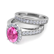 Halo Bridal Set: Milgrain Diamond and Pink Sapphire Wedding Ring Set in 14k Gold, 7x5mm