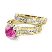 Bridal Set of Heirloom Diamond and Pink Sapphire Engagement Wedding Ring in 18k Gold, 6mm