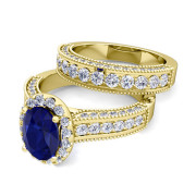 Bridal Set of Heirloom Diamond and Sapphire Engagement Wedding Ring in 18k Gold, 8x6mm