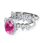 Bridal Set of Crown Set Diamond and Pink Sapphire Engagement Wedding Ring in Platinum, 7x5mm