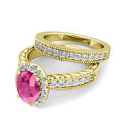 Vintage Inspired Diamond and Pink Sapphire Engagement Ring Bridal Set in 18k Gold, 7x5mm