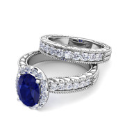 Vintage Inspired Diamond and Sapphire Engagement Ring Bridal Set in 14k Gold, 8x6mm