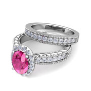 Vintage Inspired Diamond and Pink Sapphire Engagement Ring Bridal Set in Platinum, 8x6mm